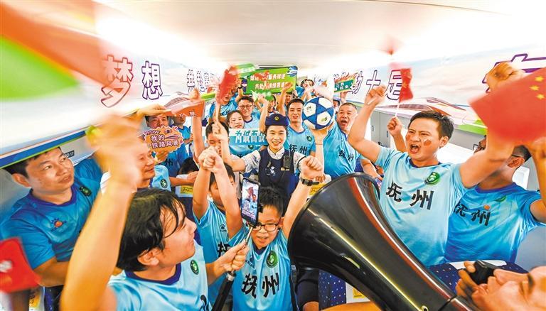 9月7日,江西省抚州火车站从抚州开往吉安西的G9812次“赣超专列”上,球迷和乘务员共同呐喊助威。“十四五”高铁新增投运里程超过1万公里,让交通出行更加便捷。