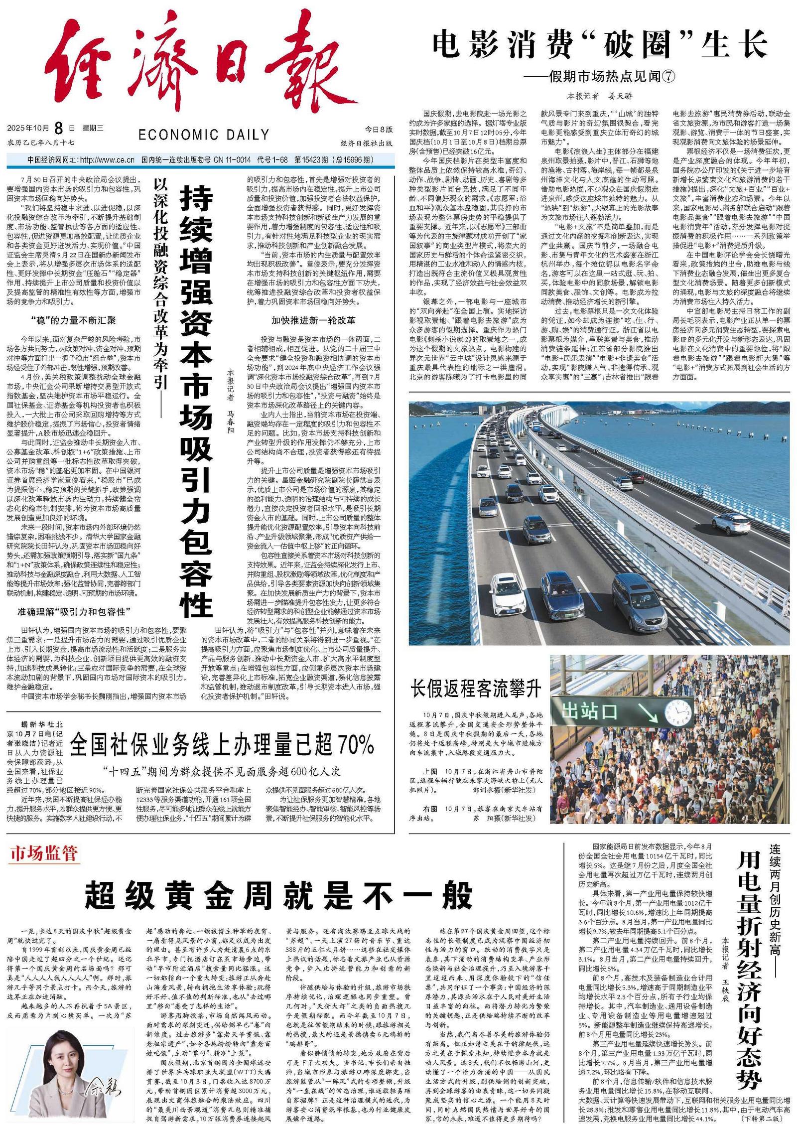 站在第27个国庆黄金周回望,这个标志性的长假制度已成为观察中国经济韧性与活力的窗口。跃动的消费数字只是表象,其下涌动的消费结构变革、产业形态焕新与社会治理提升,乃至入境游客千里迢迢而来、用深度体验投下的“信任票”,共同印证了一个事实:中国经济的深厚潜力,其源头活水在于人民对美好生活日益丰富的向往。而将潜力转化为繁荣的关键钥匙,正是供给端持续不断的改革与创新。