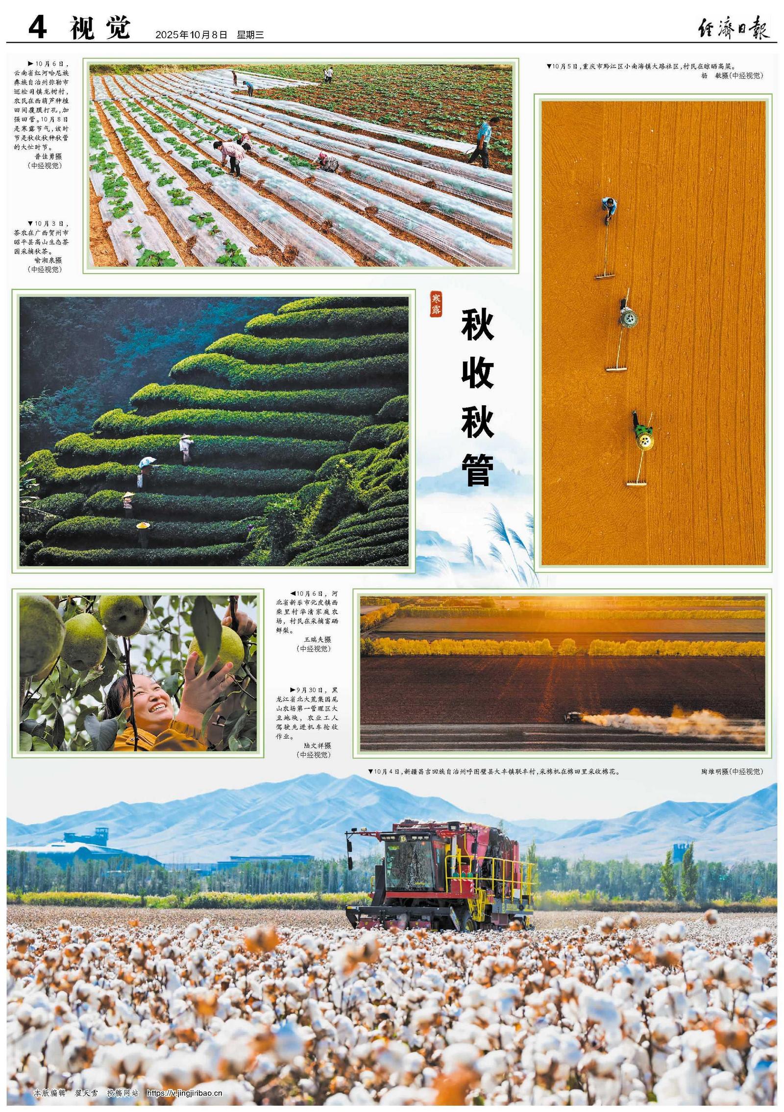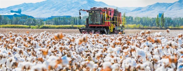 10月4日,新疆昌吉回族自治州呼图壁县大丰镇联丰村,采棉机在棉田里采收棉花。陶维明摄(中经视觉)