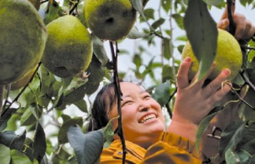 10月6日,河北省新乐市化皮镇西柴里村华清家庭农场,村民在采摘富硒鲜梨。