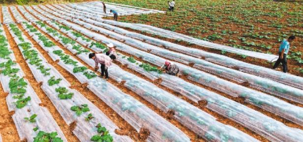 10月6日,云南省红河哈尼族彝族自治州弥勒市巡检司镇龙树村,农民在西葫芦种植田间覆膜打孔,加强田管。10月8日是寒露节气,该时节是秋收秋种秋管的大忙时节。
