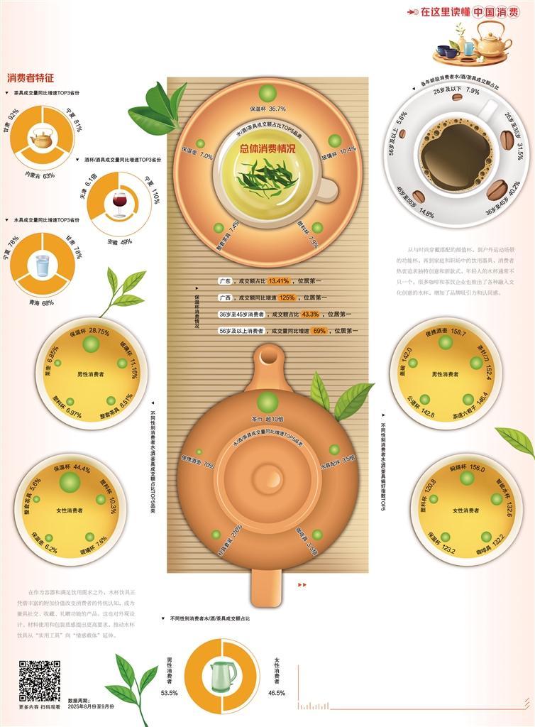 咖啡杯、随行杯、搅拌杯等场景化品类不断上新,满足消费者多样化的饮用需求。数据显示,女性消费者偏好焖烧杯、智能水杯和咖啡具,男性消费者偏好公道杯、盖碗等器皿。同时,传统茶文化的浓厚氛围也使茶具的衍生品颇受欢迎,包括茶巾、茶道六君子等。