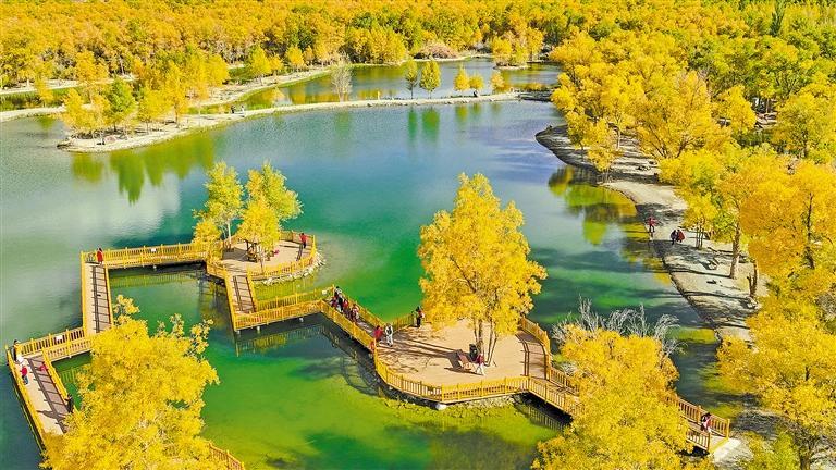 10月9日,甘肃省酒泉市金塔沙漠胡杨林景区万亩胡杨林金黄一片,美不胜收,吸引各地游客纷至沓来。