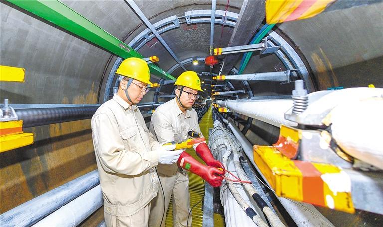 在为南京南站供电的220千伏善南—南牵线电缆隧道内,国网南京供电公司工作人员在对线路进行巡检。