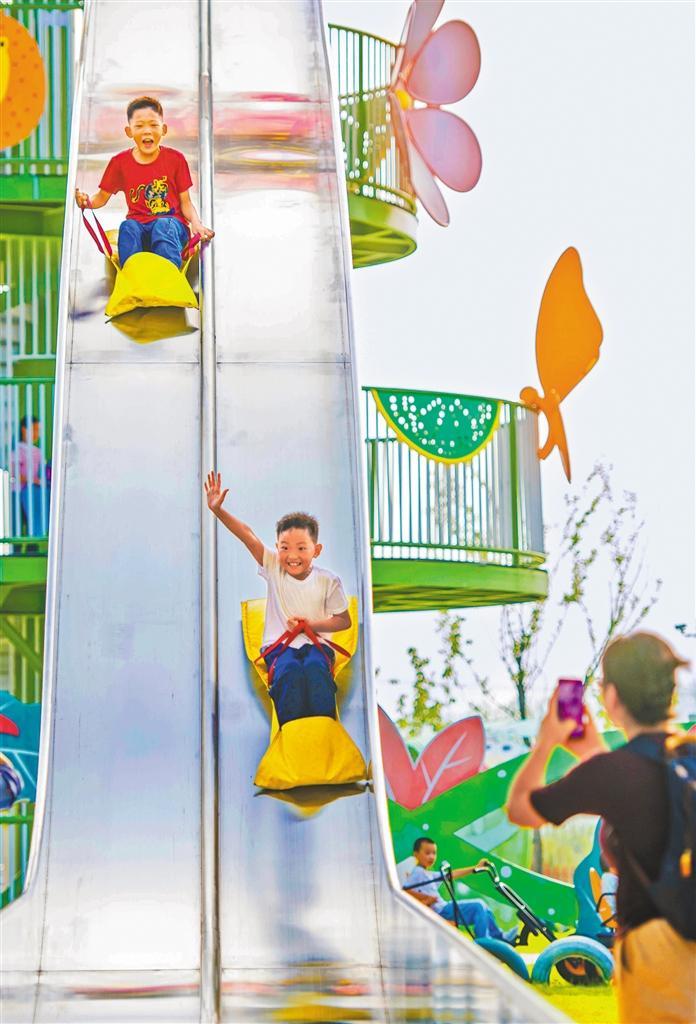 10月5日,江苏省宿迁市蔡集镇牛角村MOMO乐园,小朋友在玩滑梯。假日期间,“微度假”式乡村休闲游、“慢生活”式短途近郊游等越来越受到游客青睐。徐江海摄(中经视觉)