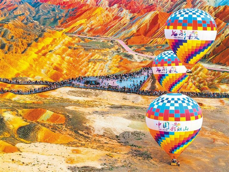 10月5日,游客在甘肃省张掖市七彩丹霞景区乘坐热气球。国庆中秋假日8天,全国国内出游8.88亿人次,较2024年国庆节假日7天增加1.23亿人次。杨 潇摄(中经视觉)