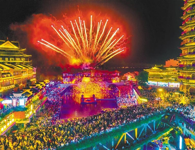 10月1日,浙江省湖州市长兴县太湖龙之梦乐园内灯光璀璨,打铁花、烟花秀等项目精彩纷呈。陈海伟摄(中经视觉)