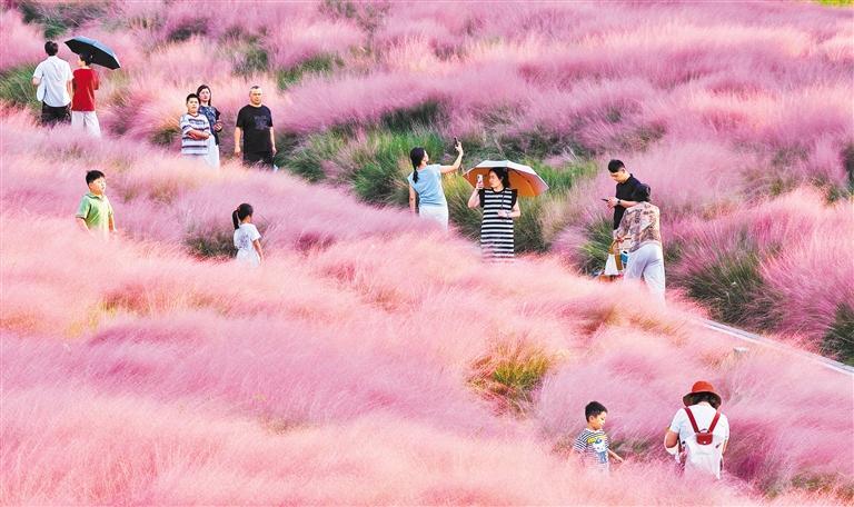 10月8日,游客在安徽省池州市平天湖国家湿地公园“粉黛花海”游玩,乐享假日美好时光。