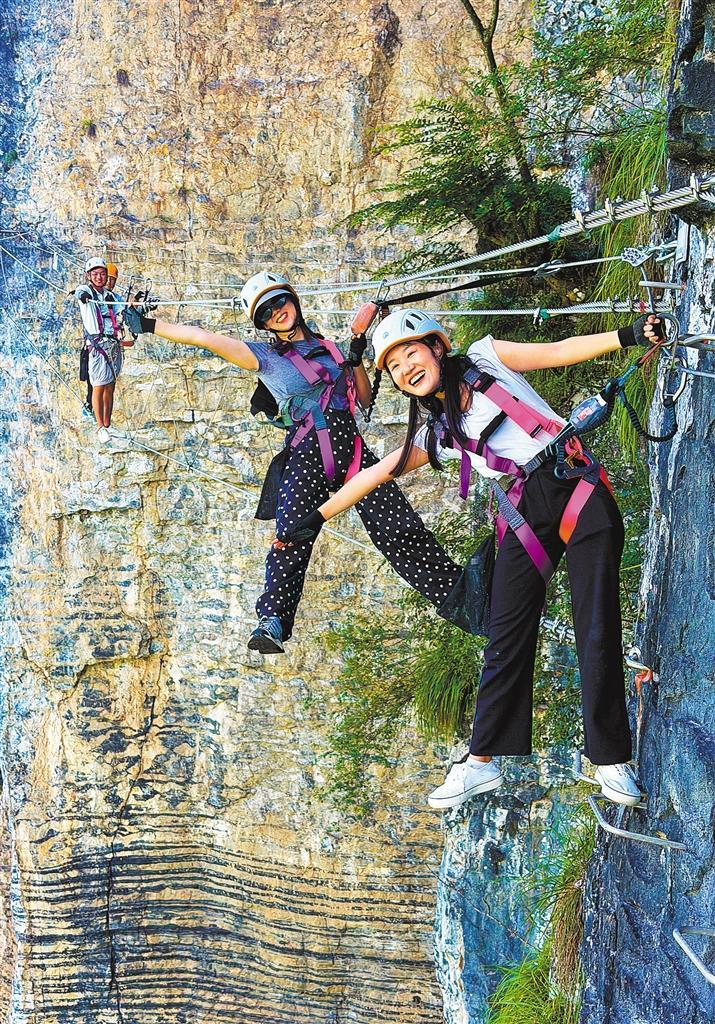 10月7日,湖北省恩施州恩施市新塘乡红花峰林景区,游客正沿着陡峭岩壁奋力攀爬,体验“飞拉达”攀岩运动。张远明摄(中经视觉)