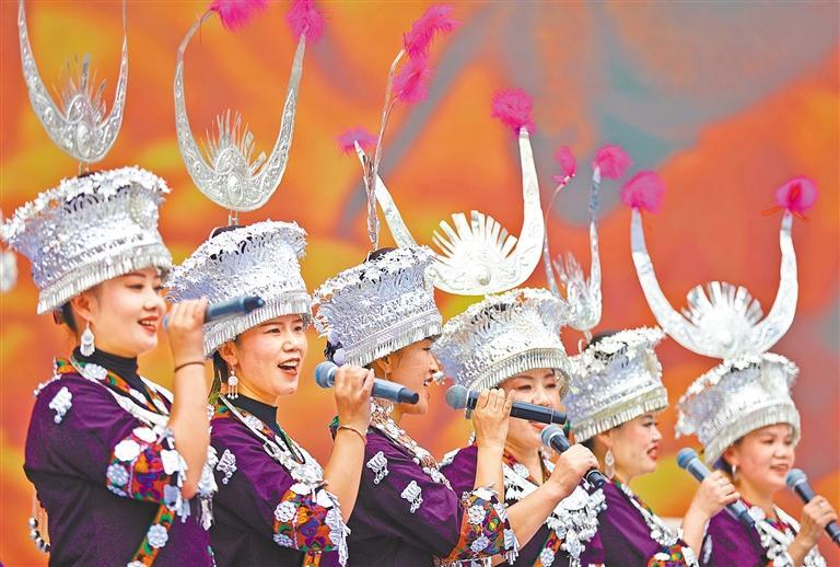 10月1日,重庆市彭水苗族土家族自治县蚩尤九黎城景区,演员在表演独具苗乡特色的歌舞节目。