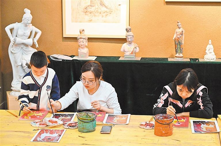 10月6日,游客在甘肃省敦煌小镇莫高山美术馆研学课堂临摹敦煌壁画,感受传统文化魅力。