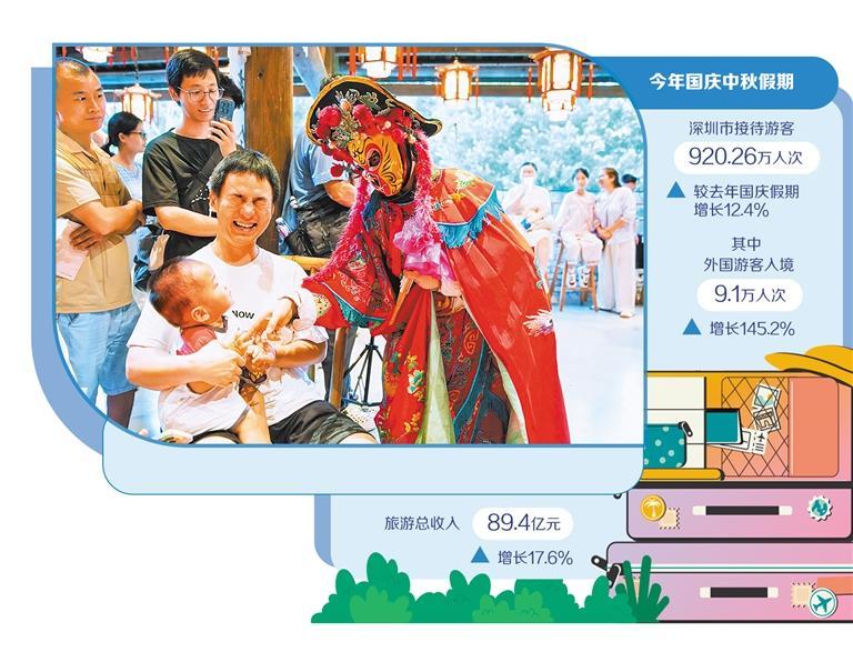 今年国庆中秋长假,深圳文旅市场热潮涌动。10月9日,深圳市文化广电旅游体育局公布的数据显示,节日期间,深圳接待游客920.26万人次,较2024年国庆假期增长12.4%;其中,外国游客入境9.1万人次,增长145.2%;旅游总收入89.4亿元,增长17.6%。