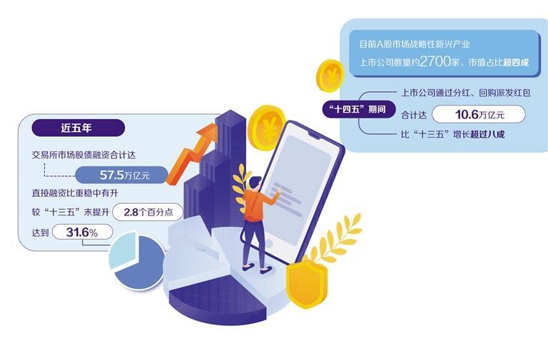 直接融资功能显著增强。近五年,交易所市场股债融资合计达57.5万亿元,直接融资比重稳中有升,较“十三五”末提升2.8个百分点,达到31.6%。资本市场从规模扩张转向质量提升,“含科量”浓郁。近年来,新上市企业中九成以上是科技企业或者科技含量比较高的企业;目前A股市场战略性新兴产业上市公司数量约2700家,市值占比超四成。