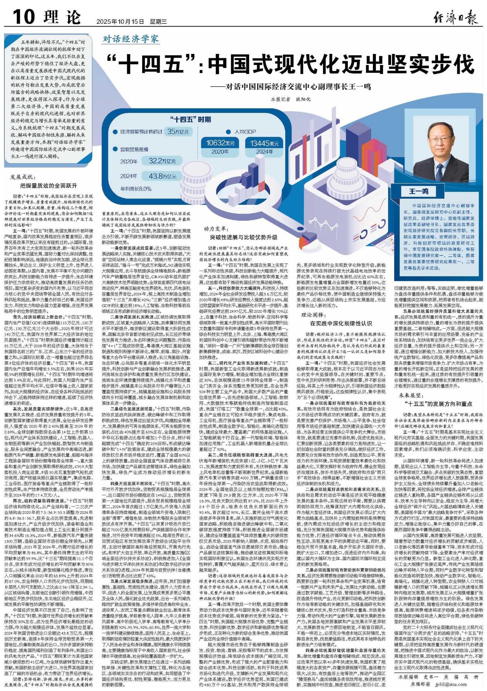王一鸣:“十四五”时期,我国在发展上实现了一系列标志性突破,科技创新能力大幅提升,现代化产业体系加速构建,绿色低碳转型取得重大进展,这些都有助于推动我国经济发展动能转换。