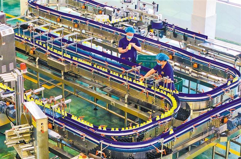 近日,工人在江西省吉安市峡江县中润食品有限公司智慧车间生产双柚汁。该县大力实施科技兴企战略,积极引导企业应用物联网、智能仓储等新技术,提高生产效率和管理水平。