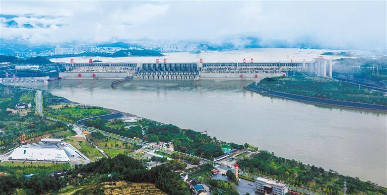 10月19日拍摄的湖北省宜昌市三峡枢纽。截至10月17日,长江干流乌东德、白鹤滩、溪洛渡、向家坝、三峡和葛洲坝6座电站构成的世界最大清洁能源走廊,累计发电量突破4万亿千瓦时。今年前三季度清洁能源走廊发电量达2351亿千瓦时,在用电高峰时期有力支撑了电网安全稳定运行。