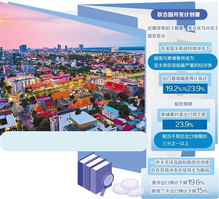柬埔寨的处境更为严峻。该国58%的出口依赖美国市场,是全球对美贸易依赖度最高的国家之一。服装、鞋类和旅行用品占据其出口较大比重,而这些劳动密集型产业正是美加征关税举措的重点打击对象。报告预测,柬埔寨对美出口将下降23.9%,相当于其总出口规模的三分之一以上。