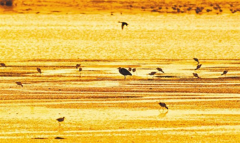 10月20日,山东省青岛市城阳区棘洪滩街道前海西,成群候鸟在河流入海口湿地觅食,金色霞光与觅食的候鸟构成一幅美景。