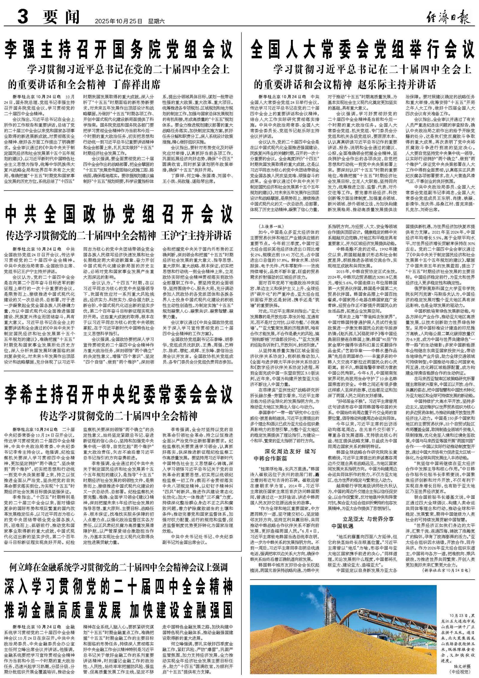 会议指出,习近平总书记在全会上所作的工作报告和重要讲话,总结了党的二十届三中全会以来党和国家各项事业取得的新进展新成就,对贯彻落实全会精神、做好各方面工作提出了明确要求。全会审议通过的《中共中央关于制定国民经济和社会发展第十五个五年规划的建议》,以习近平新时代中国特色社会主义思想为指导,统筹中华民族伟大复兴战略全局和世界百年未有之大变局,准确把握“十五五”时期党和国家事业发展的历史方位,系统总结了“十四五”时期我国发展取得的重大成就,深入分析了“十五五”时期面临的新形势新要求,对未来五年发展作出顶层设计和战略擘画,为做好“十五五”时期各项工作、开创中国式现代化建设新局面提供了科学指南。国务院党组和国务院各部门要把学习贯彻全会精神作为当前和今后一个时期的重大政治任务,切实把思想和行动统一到习近平总书记重要讲话精神和全会部署上来,扎扎实实做好“十五五”时期经济社会发展工作。