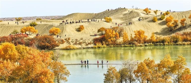 10月25日,新疆巴音郭楞蒙古自治州尉犁县葫芦岛景区,金色的胡杨林与碧水沙丘构成一幅美丽画卷,吸引了众多游客前来观赏。