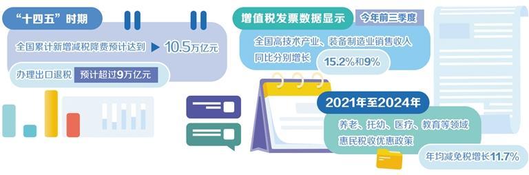 “‘十四五’时期,国家出台了一系列减税降费政策,全国累计新增减税降费预计达到10.5万亿元,办理出口退税预计超过9万亿元,有力促进了经济社会向好、向新。”国家税务总局局长胡静林在此前国务院新闻办公室举行的“高质量完成‘十四五’规划”系列主题新闻发布会上介绍,从税务登记的数据看,截至今年上半年,全国涉税经营主体突破1亿户,比2020年净增加3000万户,显示出我国市场活力足、韧性强。