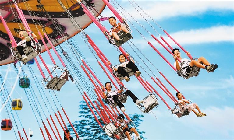10月5日,广西壮族自治区贺州市富川瑶族自治县柳家乡虎头村的七彩欢乐谷游乐园,小朋友在体验空中飞椅项目。近年来,当地不断完善各类旅游设施,丰富乡村旅游业态。