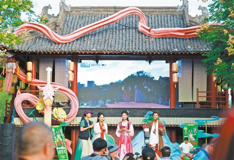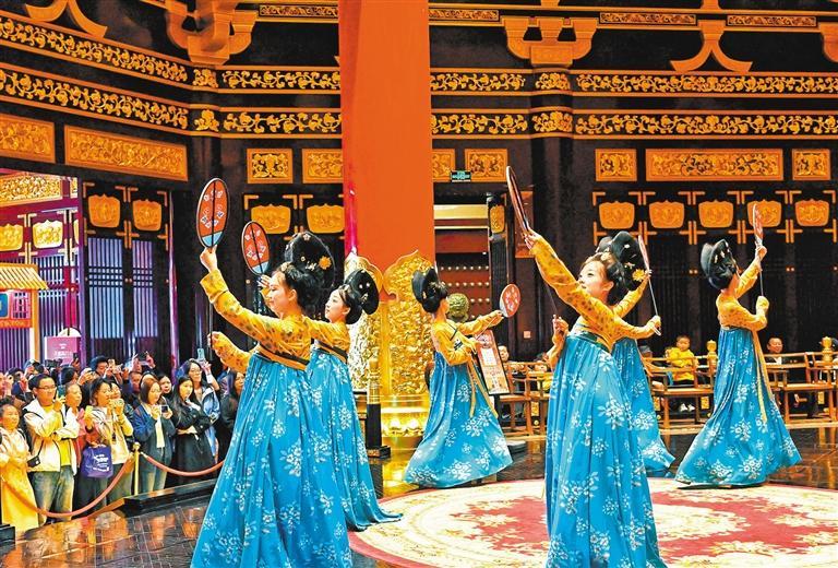 10月11日,游客在河南省洛阳市隋唐洛阳城欣赏古风舞蹈表演。张光辉摄(中经视觉)