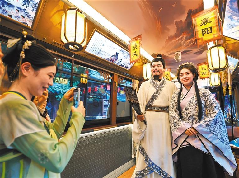 10月5日,湖北省襄阳市古隆中景区,工作人员扮演影视剧角色在“侠义襄阳”旅游公交上与游客互动。杨 东摄(中经视觉)