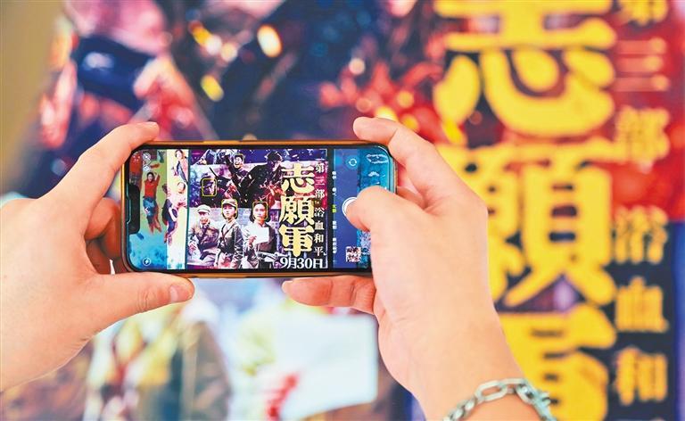 10月7日,观众在云南省蒙自市一电影院内拍摄电影《志愿军》海报。截至10月2日,2025年电影总票房突破425.02亿元,超2024年全年总票房。薛莹莹摄(中经视觉)
