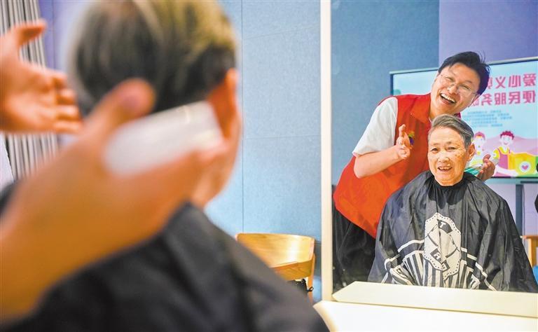 10月24日,浙江省湖州市长兴县雉城街道高家墩居民区,青年志愿者为老人义务理发。 陈海伟摄(中经视觉)
