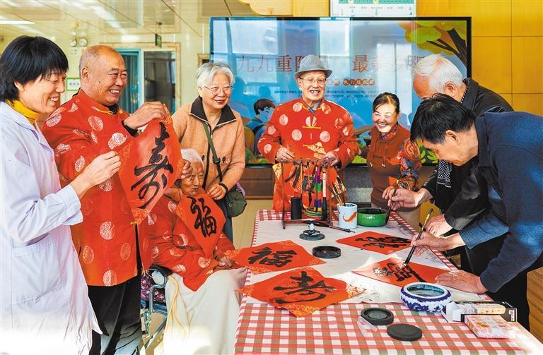 10月27日,内蒙古呼和浩特市,志愿者在玉泉区民政局“爱心敬老 情暖重阳”主题活动现场为老人书写“寿”字。丁根厚摄(中经视觉)