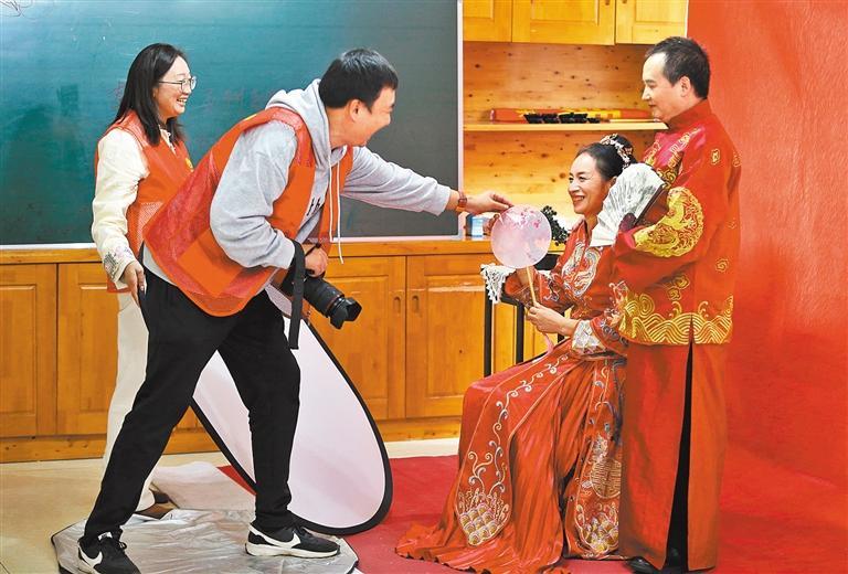 10月22日,四川省乐山市市中区海棠街道县街社区举办重阳节特别活动,摄影师志愿者免费为老人拍结婚纪念照。 李华时摄(中经视觉)