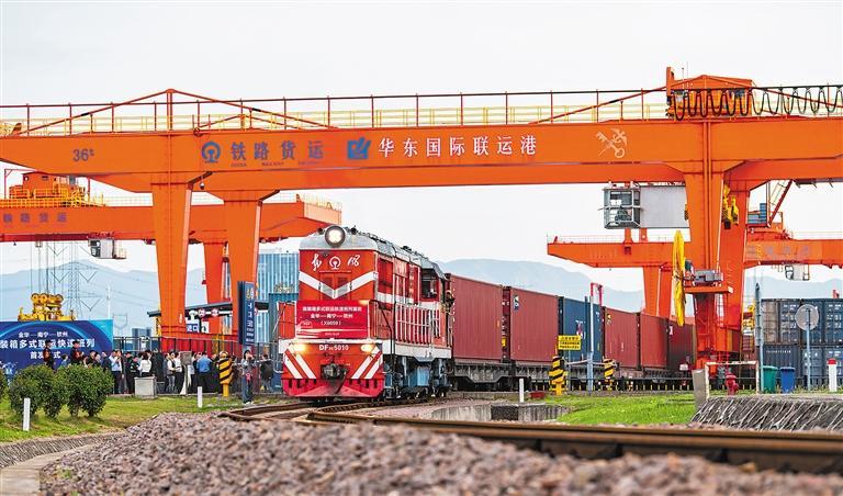 10月29日,一列集装箱多式联运快速班列从浙江金华南站驶出,将先后抵达广西南宁南站、钦州港东站。该班列线路预计一年可实现集装箱运量超1万标箱,形成一条由长三角出发,通过西部陆海新通道,至东盟国家外贸货物出口的全新物流通道。胡肖飞摄(中经视觉)