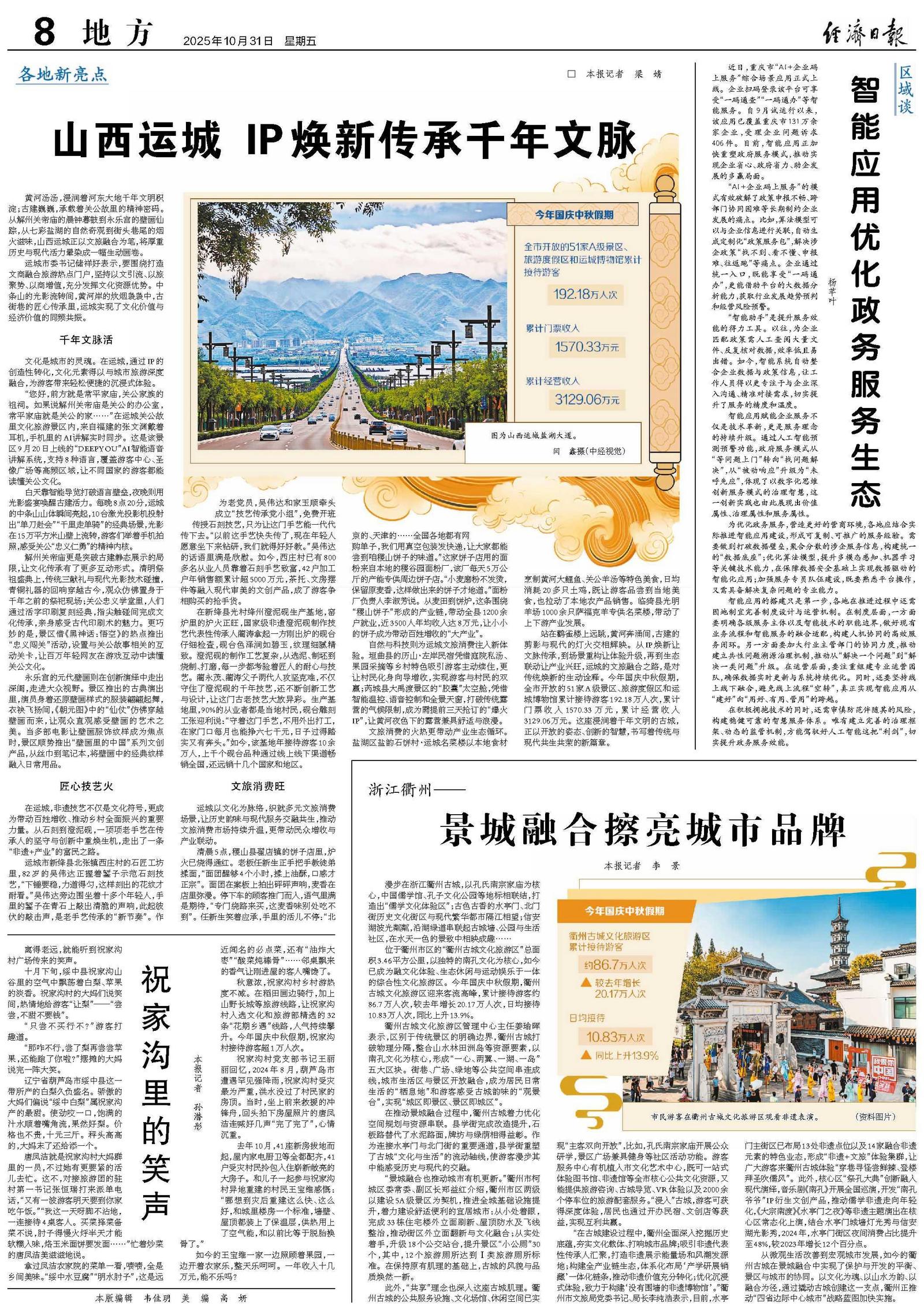 站在鹳雀楼上远眺,黄河奔涌间,古建的剪影与现代的灯火交相辉映。从IP焕新让文脉传承,到场景重构让体验升级,再到生态联动让产业兴旺,运城的文旅融合之路,是对传统焕新的生动诠释。今年国庆中秋假期,全市开放的51家A级景区、旅游度假区和运城博物馆累计接待游客192.18万人次,累计门票收入1570.33万元,累计经营收入3129.06万元。这座浸润着千年文明的古城,正以开放的姿态、创新的智慧,书写着传统与现代共生共荣的新篇章。