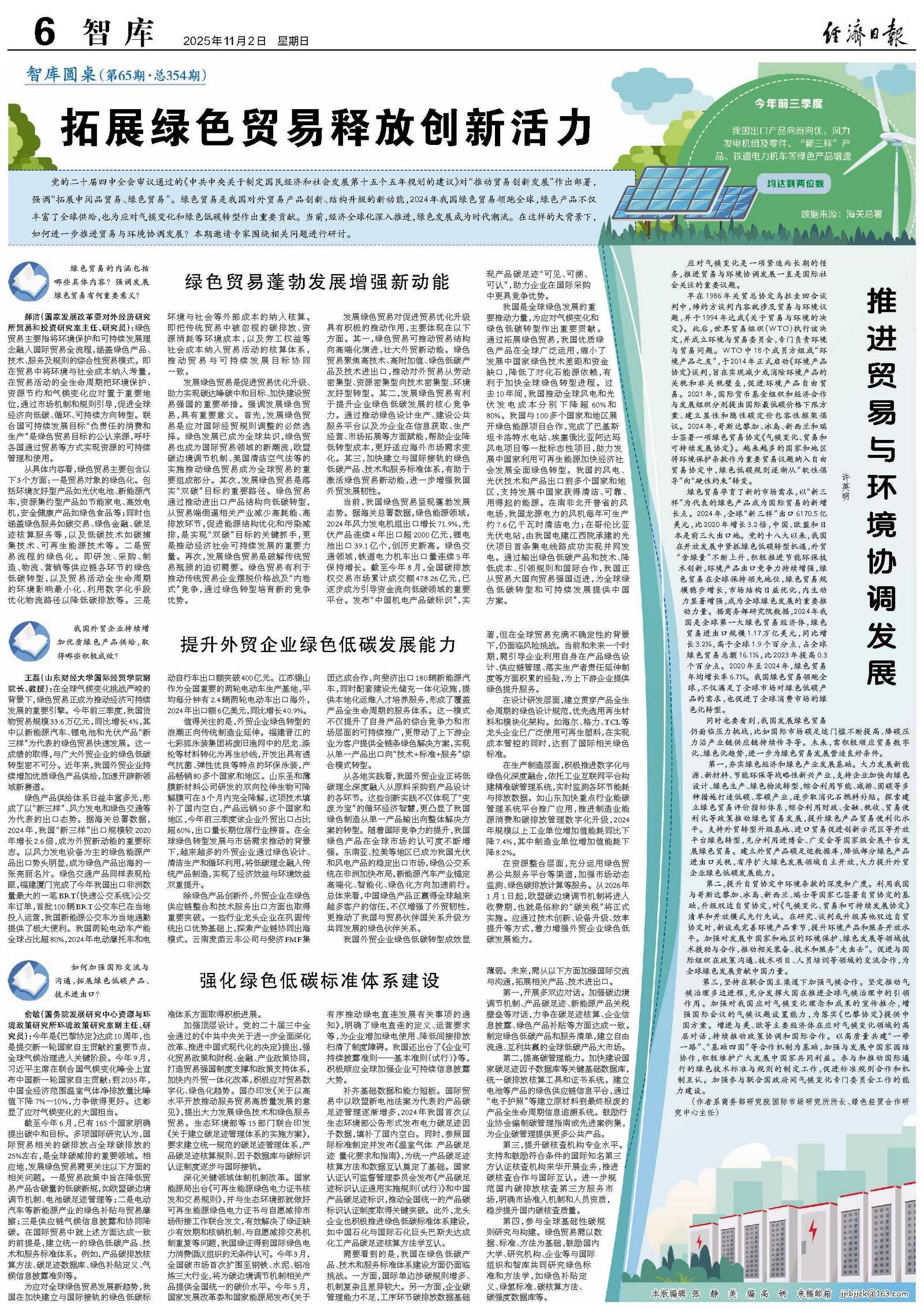 党的二十届四中全会审议通过的《中共中央关于制定国民经济和社会发展第十五个五年规划的建议》对“推动贸易创新发展”作出部署,强调“拓展中间品贸易、绿色贸易”。绿色贸易是我国对外贸易产品创新、结构升级的新动能,2024年我国绿色贸易领跑全球,绿色产品不仅丰富了全球供给,也为应对气候变化和绿色低碳转型作出重要贡献。当前,经济全球化深入推进,绿色发展成为时代潮流。在这样的大背景下,如何进一步推进贸易与环境协调发展?本期邀请专家围绕相关问题进行研讨。