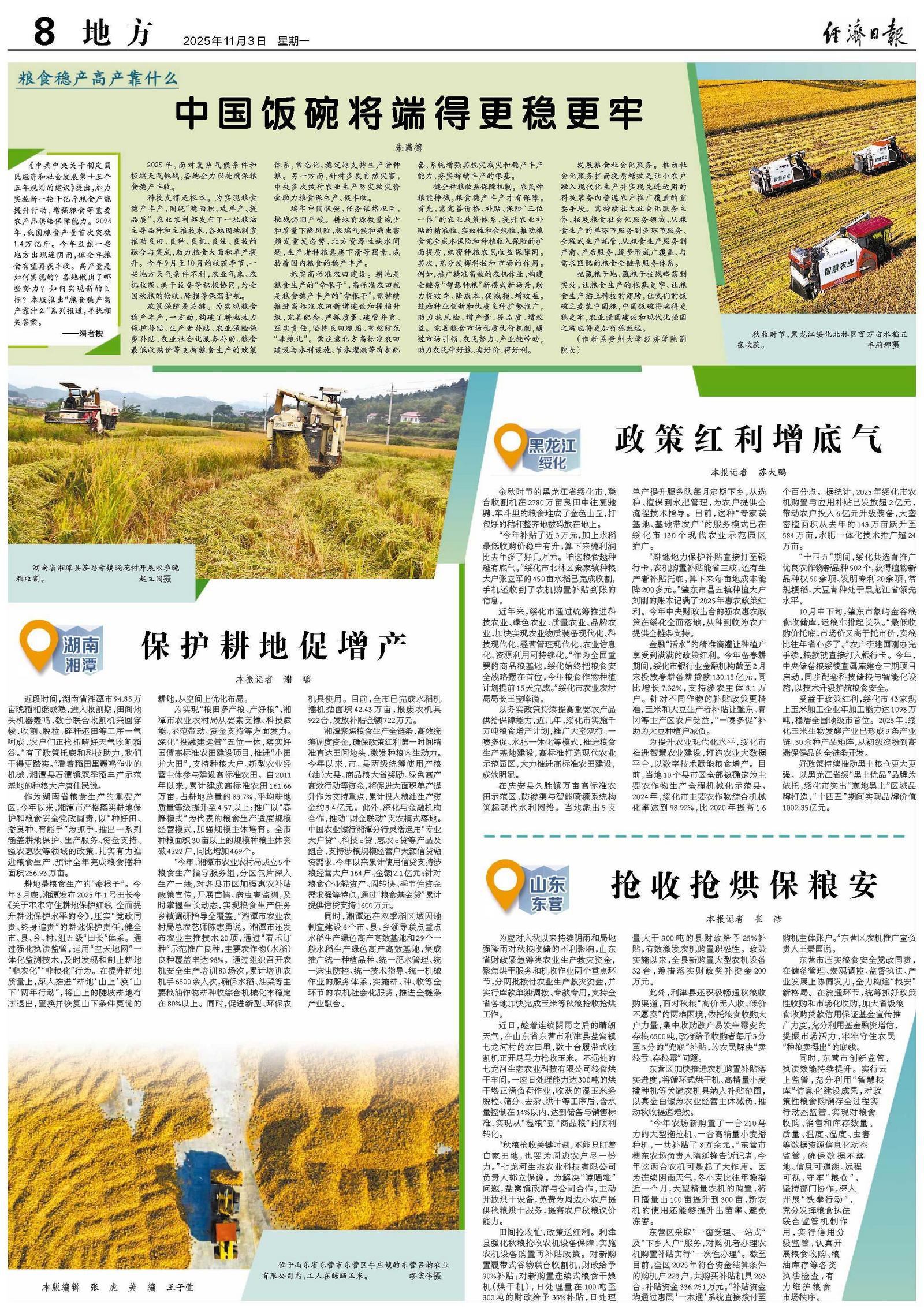 健全种粮收益保障机制。农民种粮能挣钱,粮食稳产丰产才有保障。首先,需完善价格、补贴、保险“三位一体”的农业政策体系,提升农业补贴的精准性、实效性和合规性,推动粮食完全成本保险和种植收入保险的扩面提质,织密种粮农民收益保障网。其次,充分发挥科技和市场的作用。例如,推广精准高效的农机作业,构建全链条“智慧种粮”新模式新场景,助力提效率、降成本、促减损、增效益。鼓励种业创新和优质良种扩繁推广,助力抗风险、增产量、提品质、增效益。完善粮食市场优质优价机制,通过市场引领、农民努力、产业链带动,助力农民种好粮、卖好价、得好利。