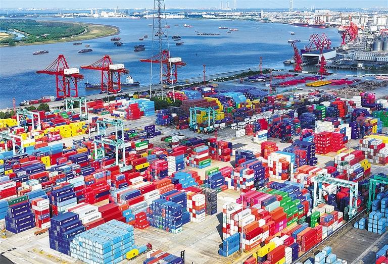 10月29日,江苏省苏州港张家港港区集装箱码头,船舶正在装卸货物。今年前三季度,苏州市进出口总额突破2万亿元,达20244.4亿元,同比增长6.1%。其中,出口总额12667.9亿元,增长7.6%;进口总额7576.5亿元,增长3.8%。施柏荣摄(中经视觉)