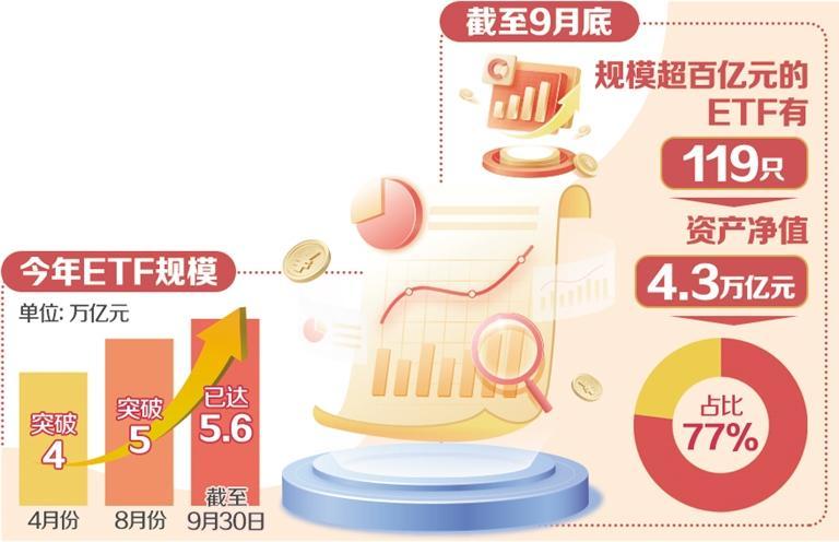 交易型开放式指数基金(ETF)市场正式进入5万亿元时代。Wind数据显示,截至9月底,全市场ETF规模突破5.6万亿元,创历史新高。ETF规模快速攀升,既得益于权益市场持续回暖、投资者对ETF产品认可度提升,也反映出我国资本市场结构不断优化,指数化投资日益走向成熟,迎来快速发展阶段。