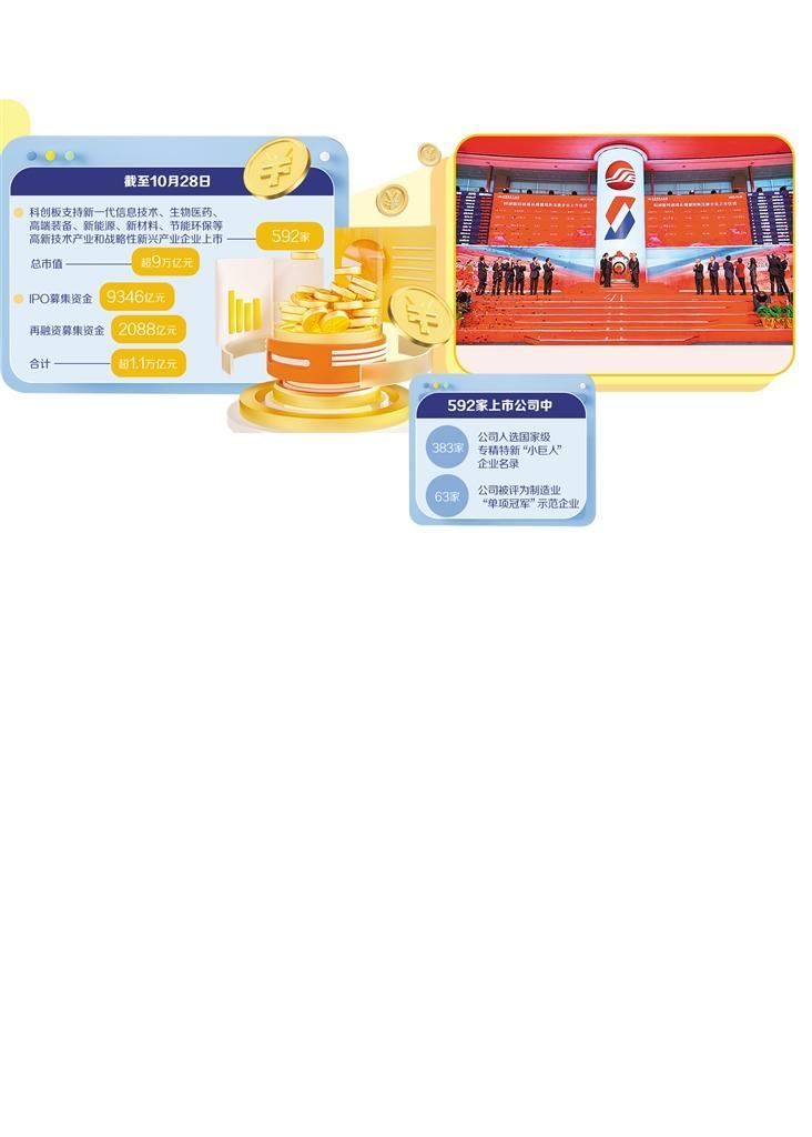 坚守“硬科技”定位。截至10月28日,科创板支持新一代信息技术、生物医药、高端装备、新能源、新材料、节能环保等高新技术产业和战略性新兴产业企业上市592家,总市值超9万亿元。IPO募集资金9346亿元,再融资募集资金2088亿元,合计超1.1万亿元。
