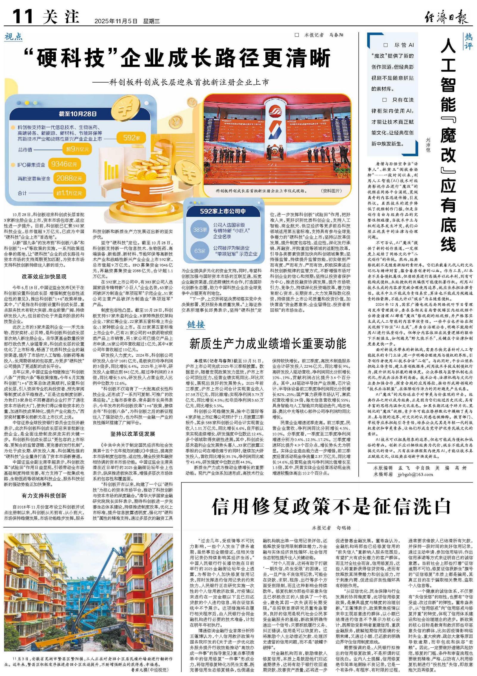 10月28日,科创板迎来科创成长层首批3家新注册企业上市,资本市场包容度、适应性进一步提升。目前,科创板已汇聚592家科技企业,总市值超9万亿元,已成为中国“硬科技”企业上市“首选地”。