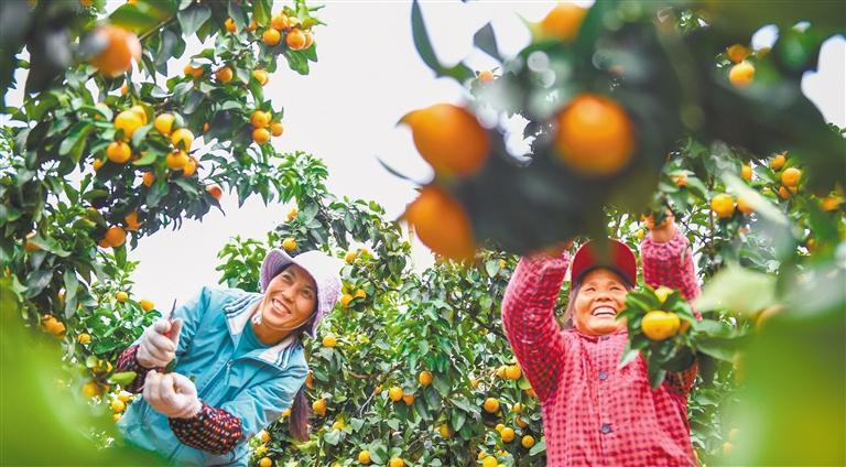11月2日,湖南省永州市道县蚣坝镇兴桥村,砂糖橘树挂满沉甸甸的果实,果农穿梭在果树间,脸上洋溢着丰收的喜悦。 蒋克青摄(中经视觉)