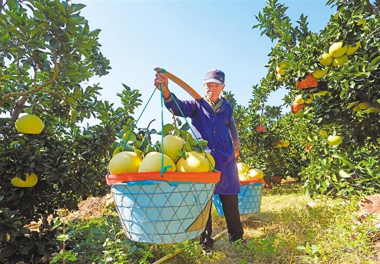 10月23日,浙江省玉环市清港镇文旦柚种植基地,果农在搬运文旦柚。今年,玉环2.9万亩文旦柚预计总产量3.02万吨,产值超4亿元。 段俊利摄(中经视觉)