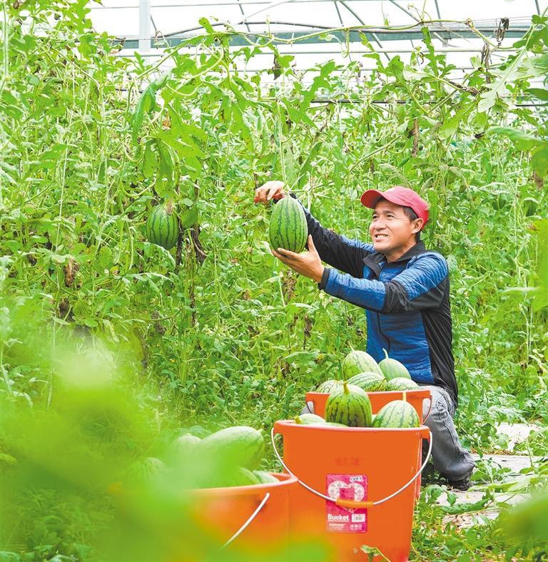 11月3日,江西省抚州市临川区荣山镇荣山村,立体栽培的“空中西瓜”迎来丰收,工作人员忙着采摘。 郭 昊摄(中经视觉)