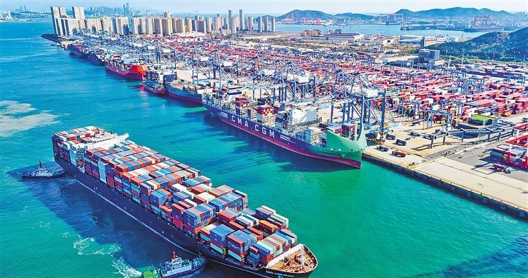 11月5日,一艘货轮满载货物驶出青岛自贸片区。“双11”临近,中国(山东)自由贸易试验区青岛片区跨境电商包裹量不断增长,商品高效通关后密集装卸船。张进刚摄(新华社发)
