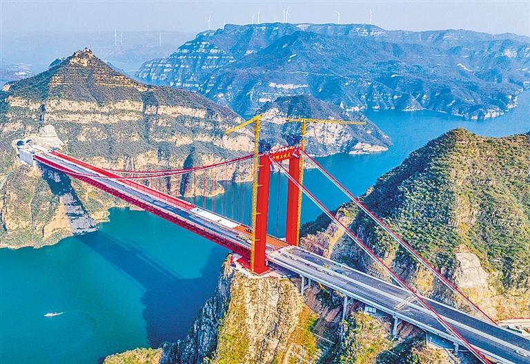 十一月三日拍摄的河南省洛阳市济新高速黄河三峡大桥建设现场。目前大桥已进入桥面沥青摊铺阶段,预计年底通车。张怡熙摄(中经视觉)