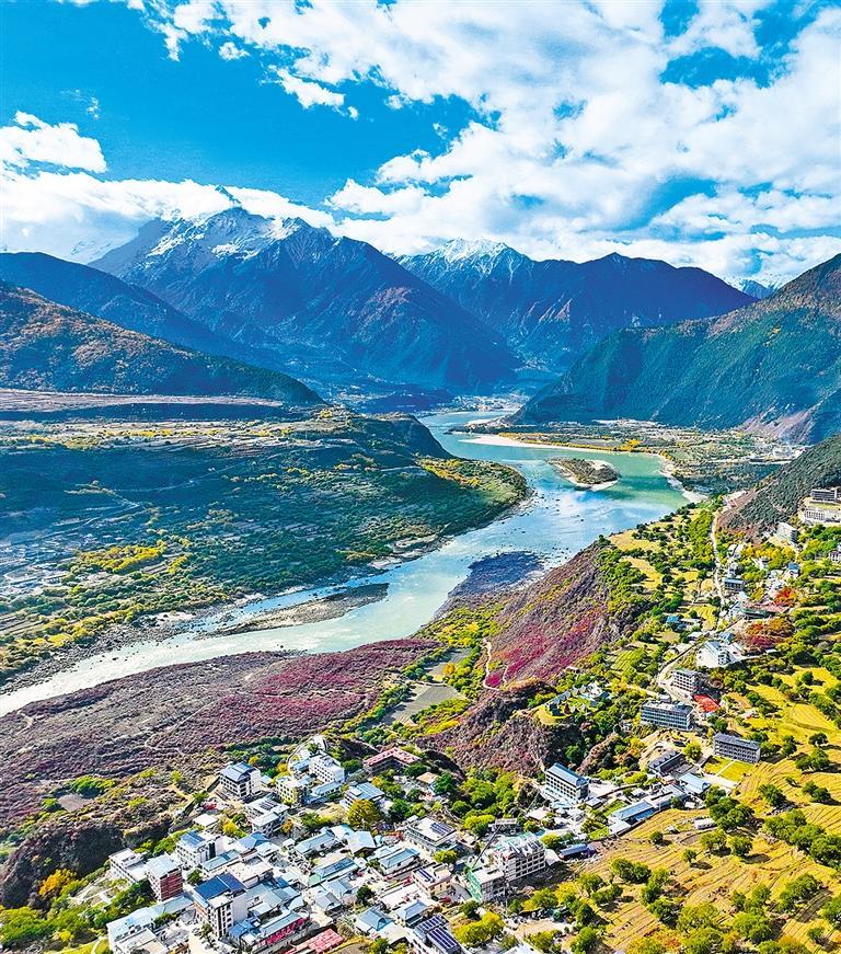 11月6日,西藏林芝米林市派镇索松村雅鲁藏布大峡谷北岸层林尽染,民居、道路、皑皑雪山、原始森林与清澈奔涌的江水,构成一幅壮美的高山峡谷生态画卷。 颜金昌摄(中经视觉)