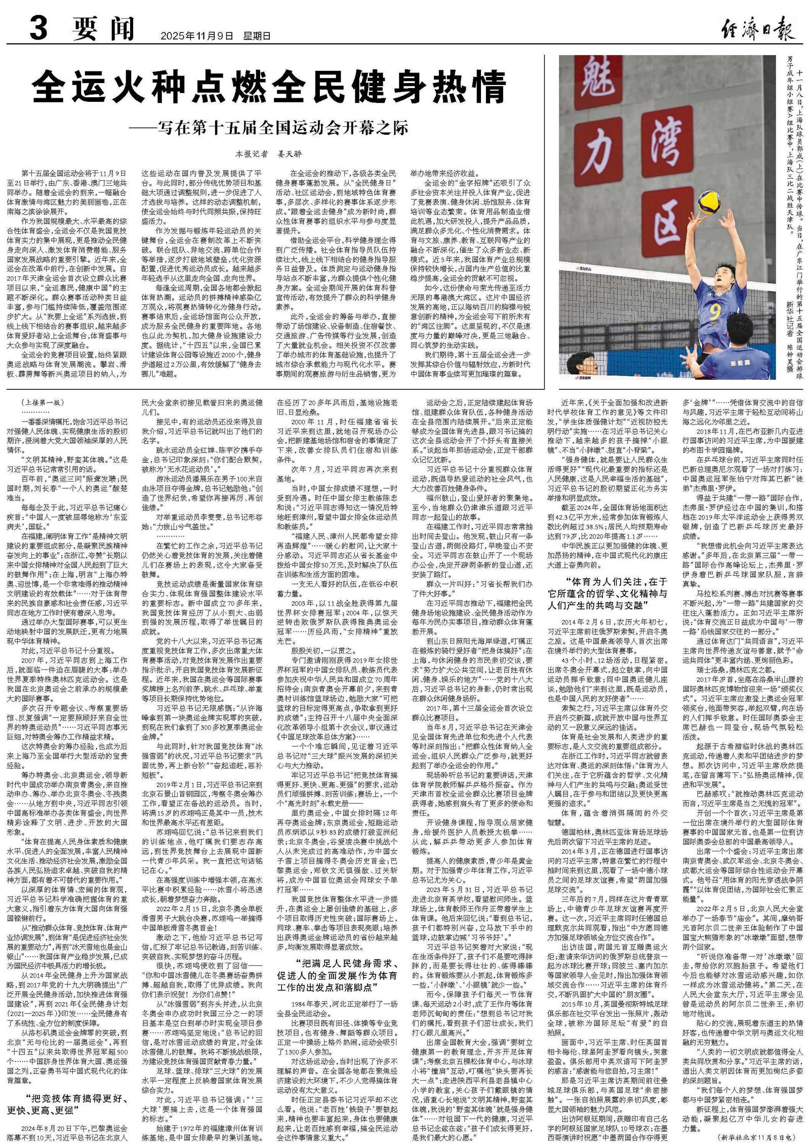 在地方工作,组织全县全民运动会,让老百姓“身体也要健康起来”;到中央,担任2008年北京奥运会、残奥会筹备工作领导小组组长,为盛会成功举办倾注心血;新时代,从人民幸福、国家强大、民族复兴的高度关心体育工作……一个个动人故事,彰显着习近平总书记对体育强国建设的高度重视、对健康中国事业的深厚情怀。