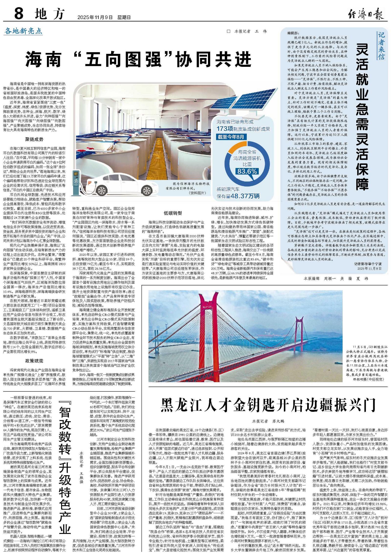 近年来,海南省紧紧围绕“三度一色”(温度、深度、纬度、绿色)资源优势,充分发挥政策优势,在种业、深海、航天、数字、绿色5大领域齐头并进,奋力“向种图强”“向海图强”“向天图强”“向绿图强”“向数图强”,产业聚链成势,生态协同共进,持续培育壮大具有海南特色的新质生产力。