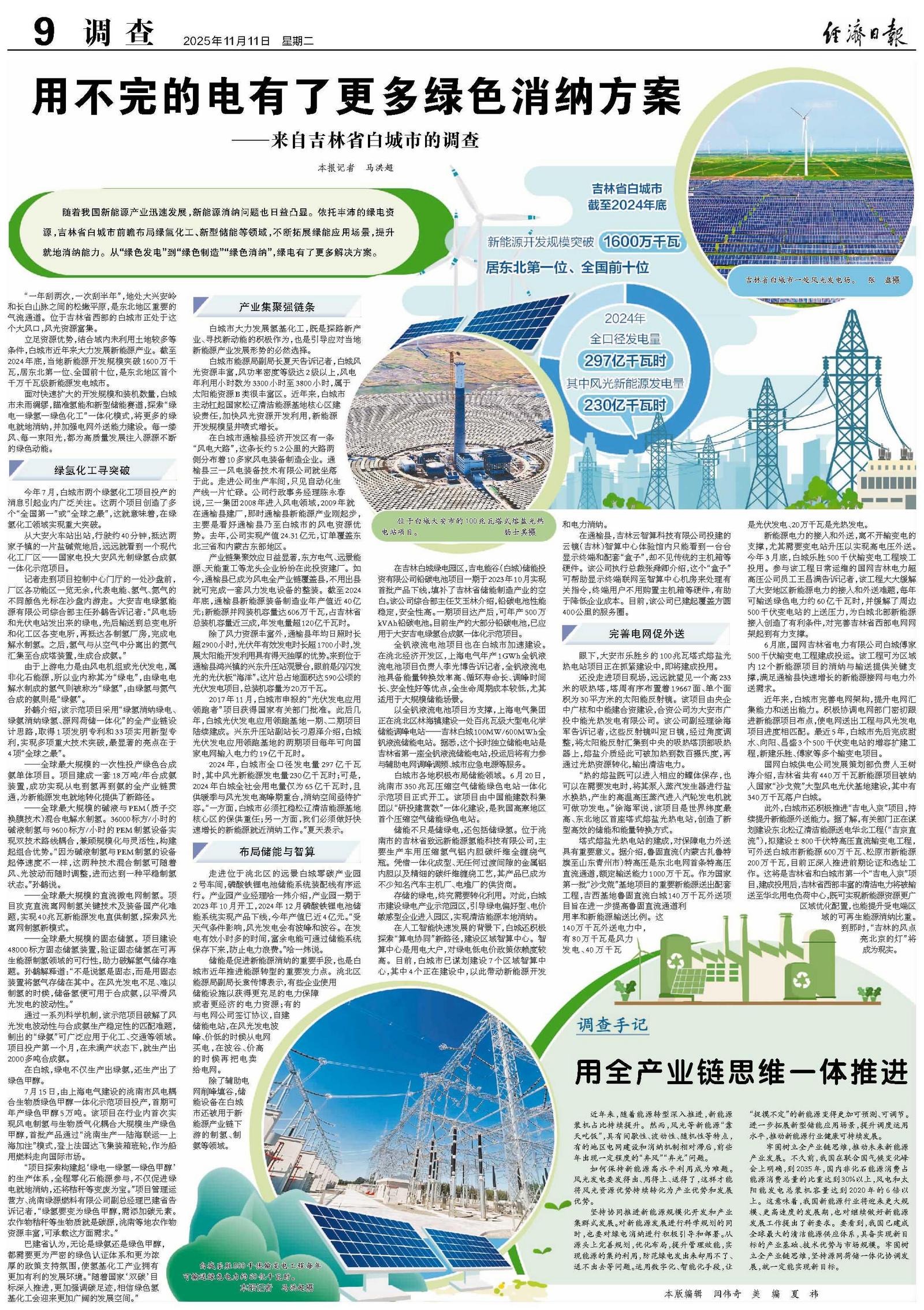 随着我国新能源产业迅速发展,新能源消纳问题也日益凸显。依托丰沛的绿电资源,吉林省白城市前瞻布局绿氢化工、新型储能等领域,不断拓展绿能应用场景,提升就地消纳能力。从“绿色发电”到“绿色制造”“绿色消纳”,绿电有了更多解决方案。