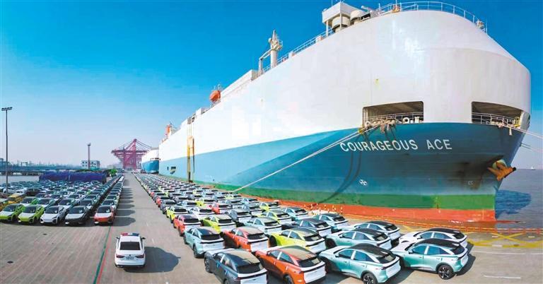 9月11日,国产新能源汽车在浦东外高桥海通码头等待登船。海通码头出口航线目前已覆盖全球131个国家和地区的289个港口,平均每天有2艘至3艘滚装船满载国产汽车扬帆出海。宫 兴摄(中经视觉)